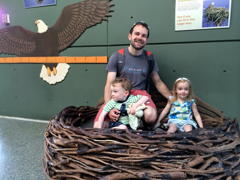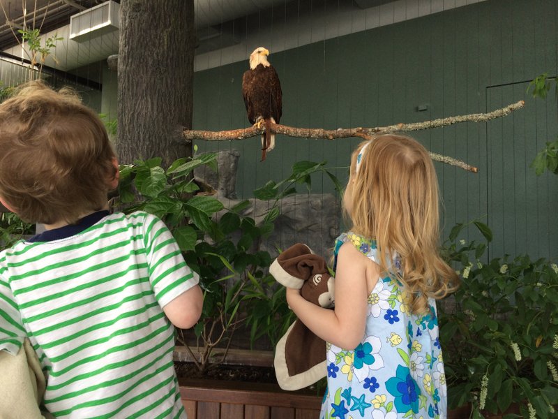 Shortly after entering the building and going up to the top level we found a live bald eagle (yes, an eagle at an aquarium… this was just one of many bird species on display throughout the facility). The majestic bird was sitting on a branch behind a thin wire containment which made for easy viewing. There was even a life size eagle nest replica which of course we climbed into (there was a sign inviting us to try)!