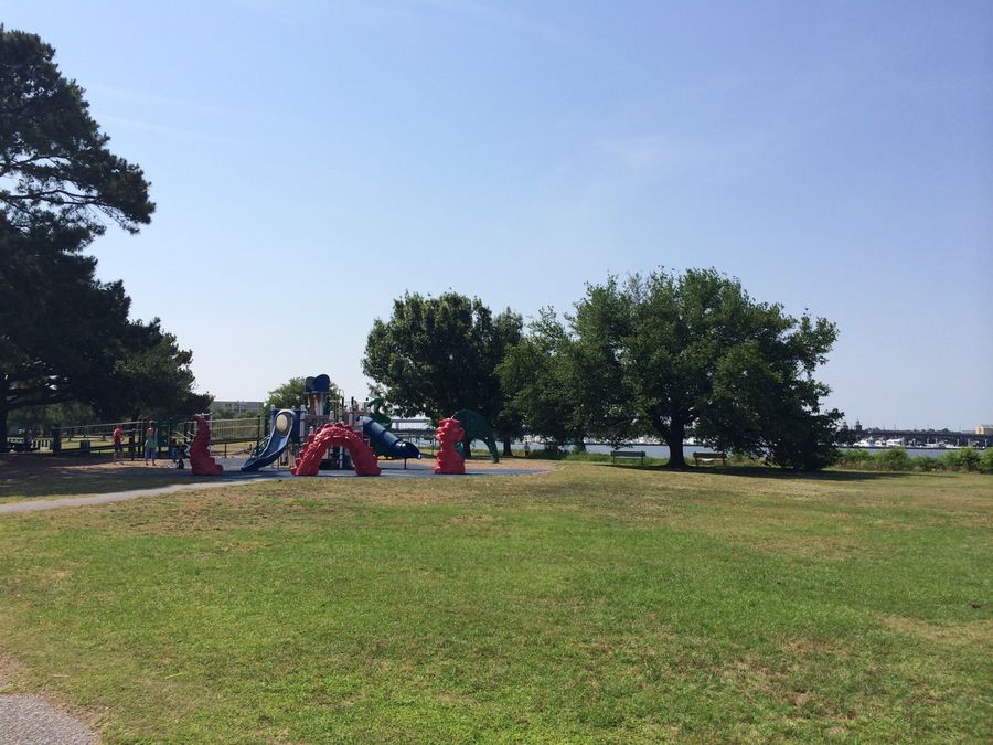 Beyond the playground there is a long wood-decked fishing pier that juts into the river at the far end of the park.