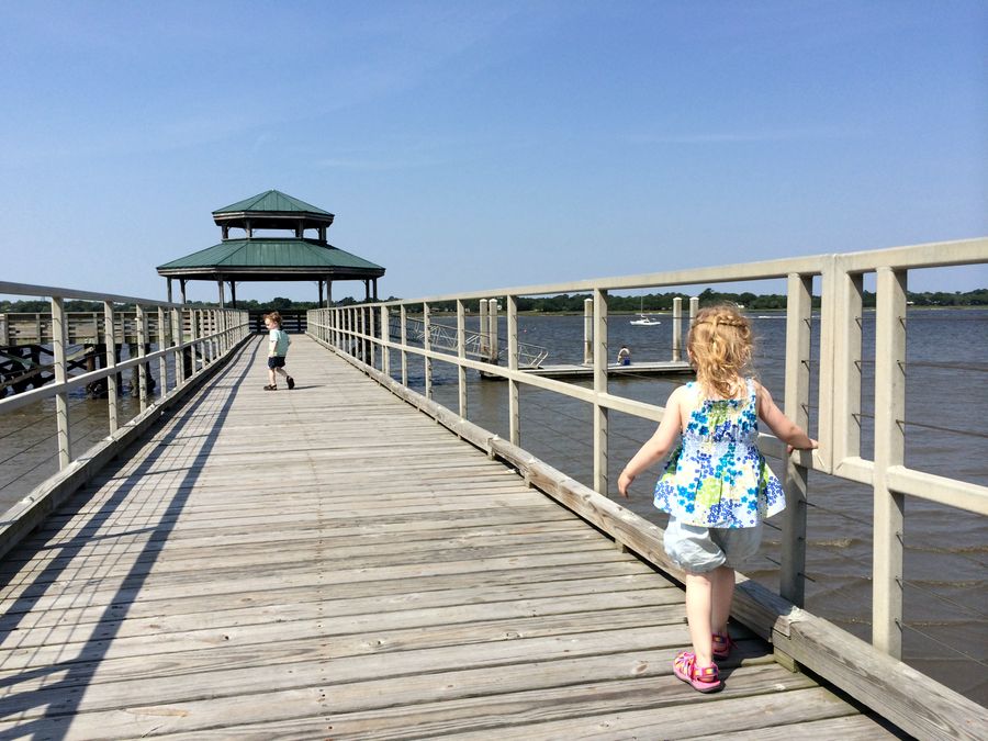 J&A got a kick out of chucking shells and leaves into the river below. There was a seemingly endless supply of little shells stuck between the planks of the pier, and running on and off the pier to get more leaves was a game in itself.