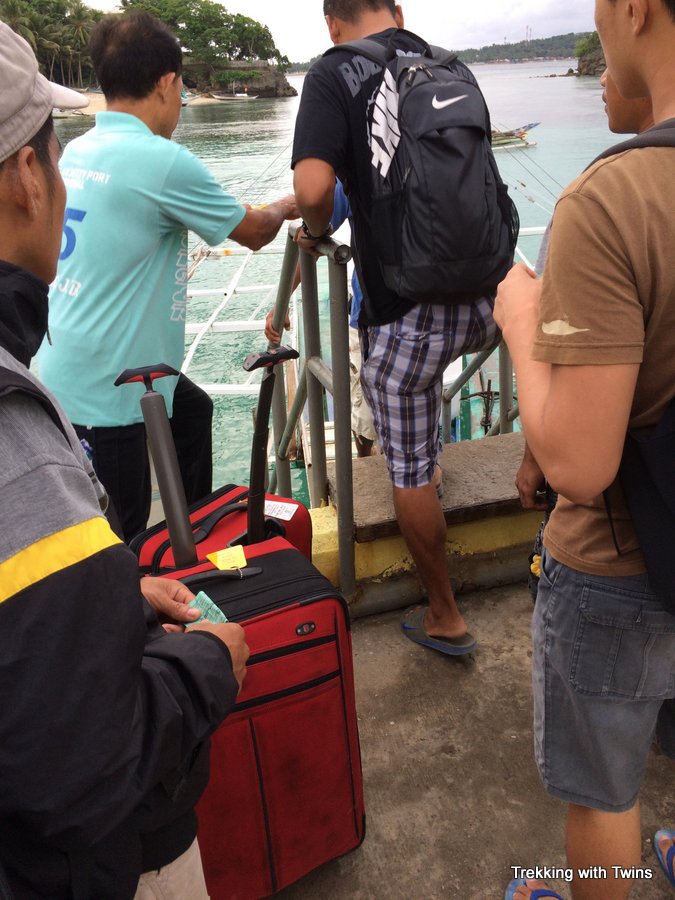 Our porter helped load our 2 larger bags onto the banca boat to Caticlan and we were off. We had learned our lesson and were very happy to pay the porter to help us this time. The gangplank was really steep due to the low tide. When traveling with kids some extra hands are always helpful. 40 pesos well spent.