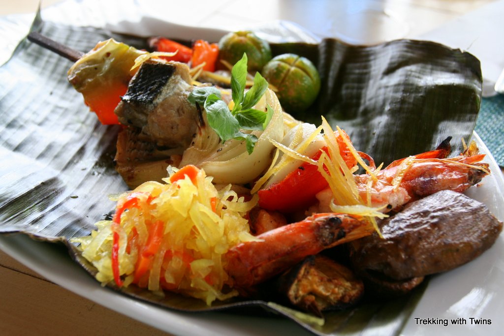 Seafood kebab served on a banana leaf at Tarsier Paprika.