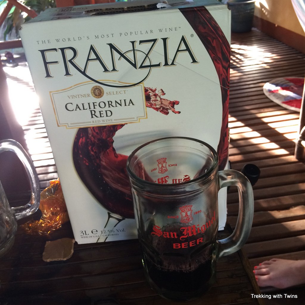 After being wine deprived for weeks we caved and bought this box of “The World’s Most Popular Wine” – and drank it from beer mugs.